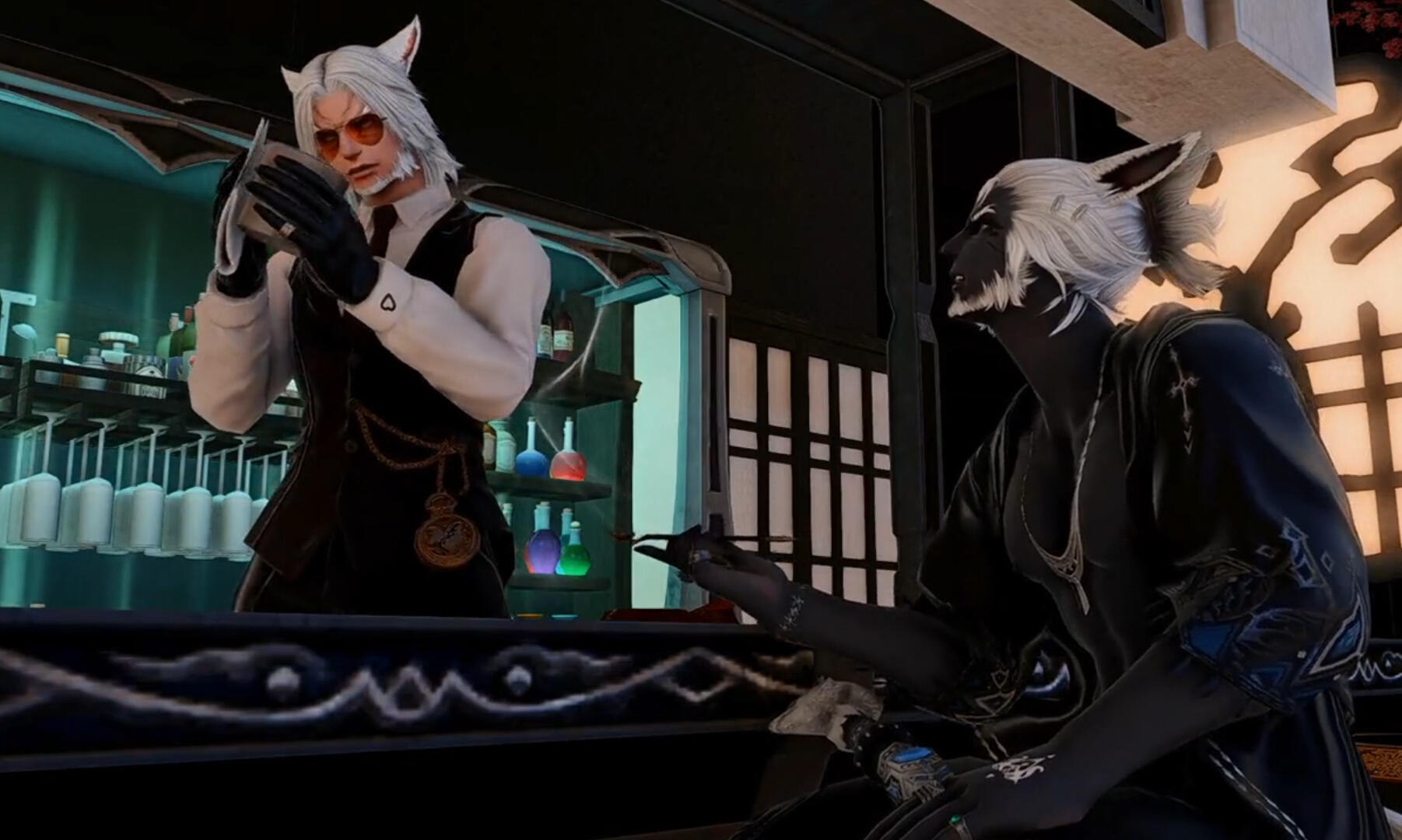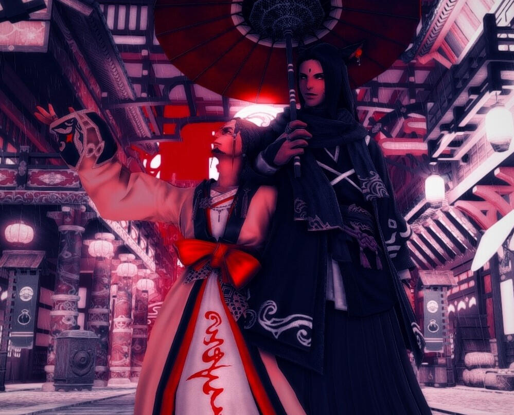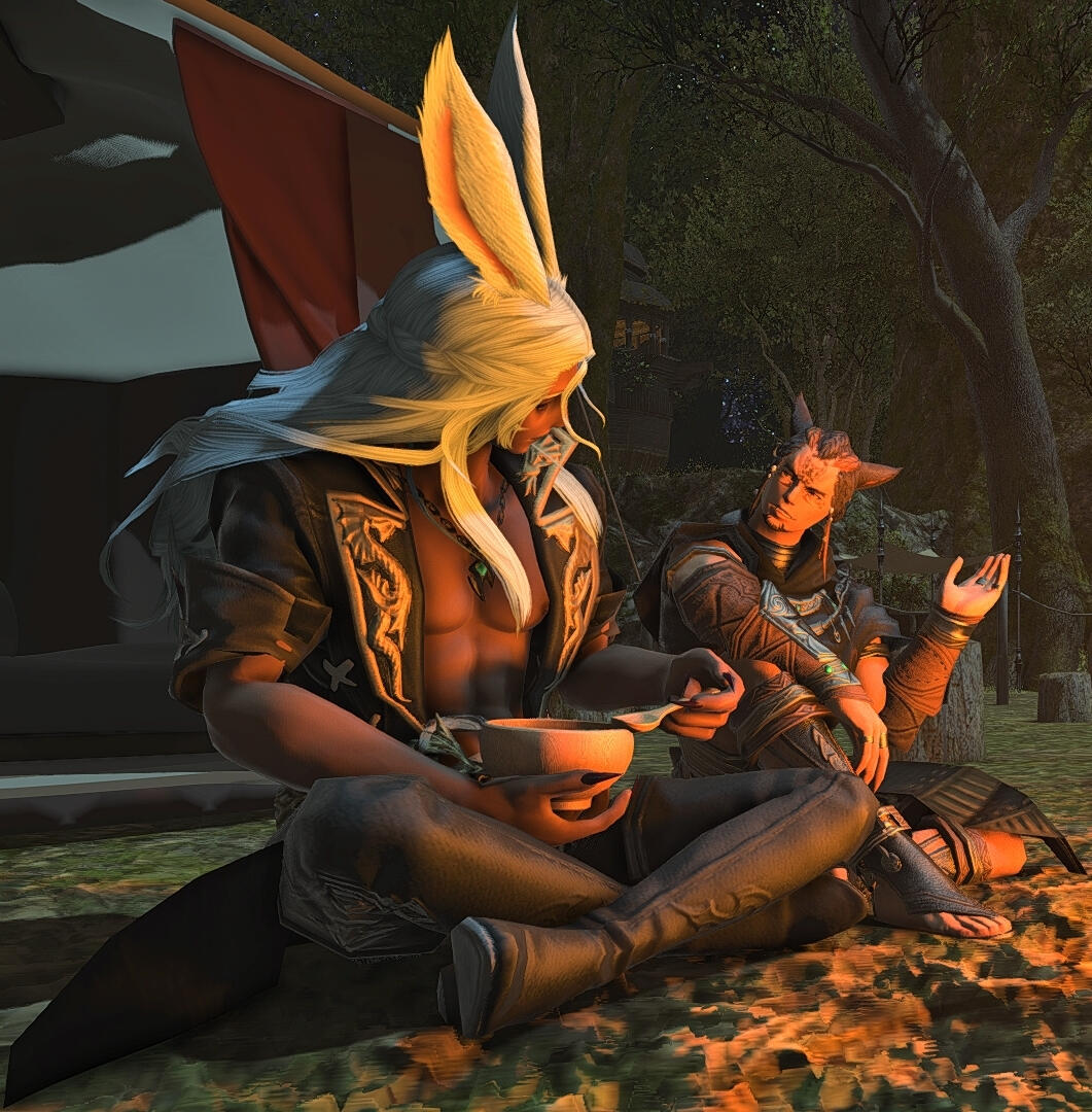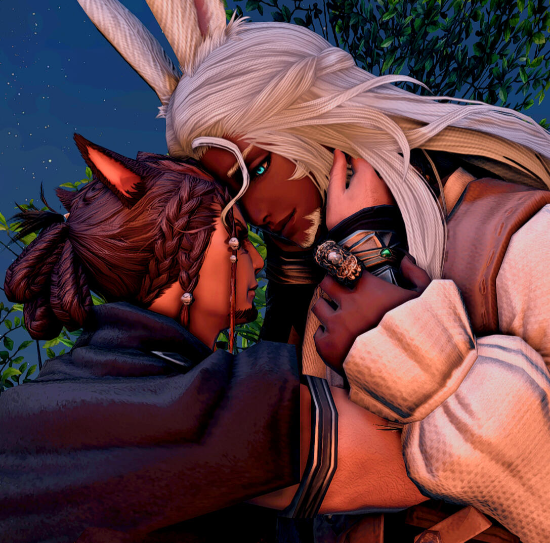 When traveling to Kugane, Tahj found himself the furthest away from home than he'd ever been. In a foreign land, with no concept of local law or where to hunt for himself, had it not been for Rhel, Tahj would have surely starved had he been left to his own devices when dining in Kugane.Having never used foreign eating utensils in his life, but determined to learn, Tahj found himself struggling when a silent albeit observant twin-tailed Vierako'te took notice, a gentle hand choosing to guide him in more ways than just a proper grip.Together they traversed throughout Kugane, Yanxia and Doma, eventually finding themselves at the hidden borders of Rhel's homeland, an ever-shifting spirit world teetering on the edge of the void where curses and a voidsent touched population thrive.Rhel belongs to @DancinNekomata