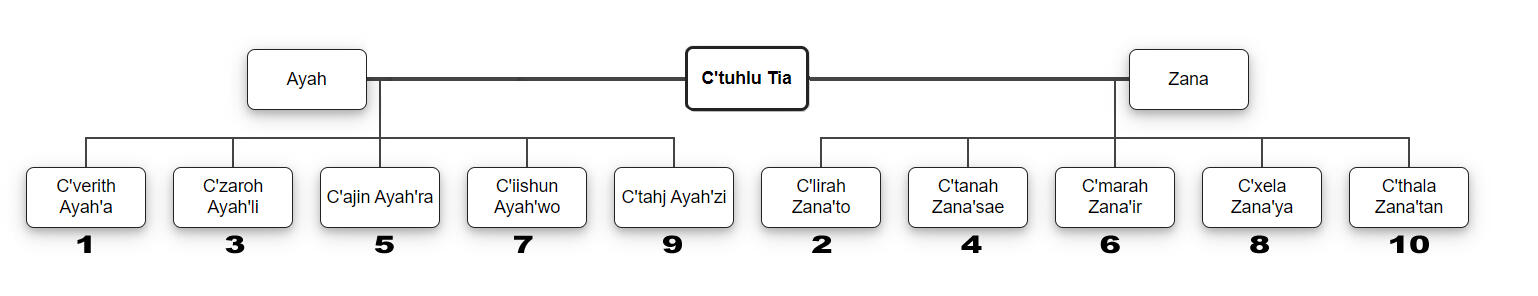 On the other hand, the naming of their children had a mix of both Sun and Moon naming conventions, the C prefix preceding their given name, their last names consisting of their mothers forename followed by the suffice indicating the order of their birth between the two Mothers.